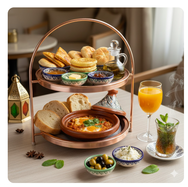 - huile d’olive du terroir, miel pur, beurre, fromage frais, olives vertes & noires, confiture maison et pain marocain.